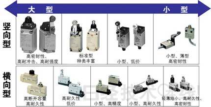 限位开关按形状可分为竖向型和横向型两种。竖向型是最常用的限位开关,外壳为竖长形状,上部带有驱动机构,从下面引出外部连接线。