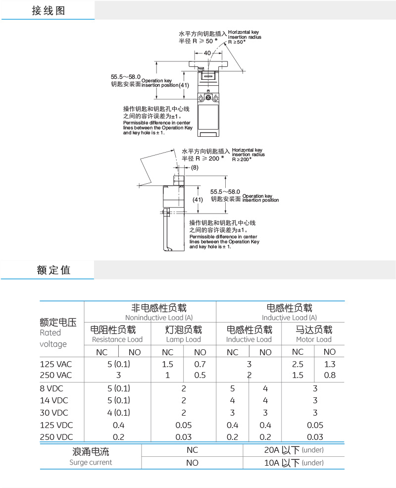 · 荣获CCC CE TuV认证的门锁式安全限位开关· 可选1NC+1NO,2NC,2NC+1NO或3NC 4种操作芯子,5种安装角度· 钥匙可以单独售卖,产品图只是安装示意,并非发货状态,用户可自行调节安装角度