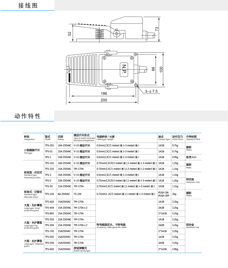 ■ 内含TuV认证开关的无包围式脚踏开关■ 加厚铝壳,内置银复合触点■ TFS-402 表示内含1只微动开关■ TFS-404 表示内含2只微动开关